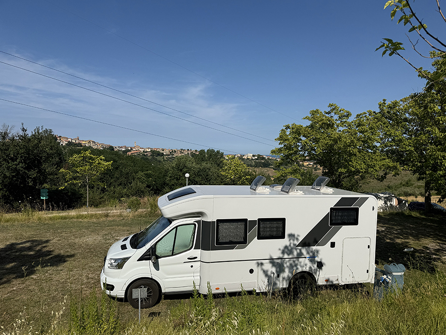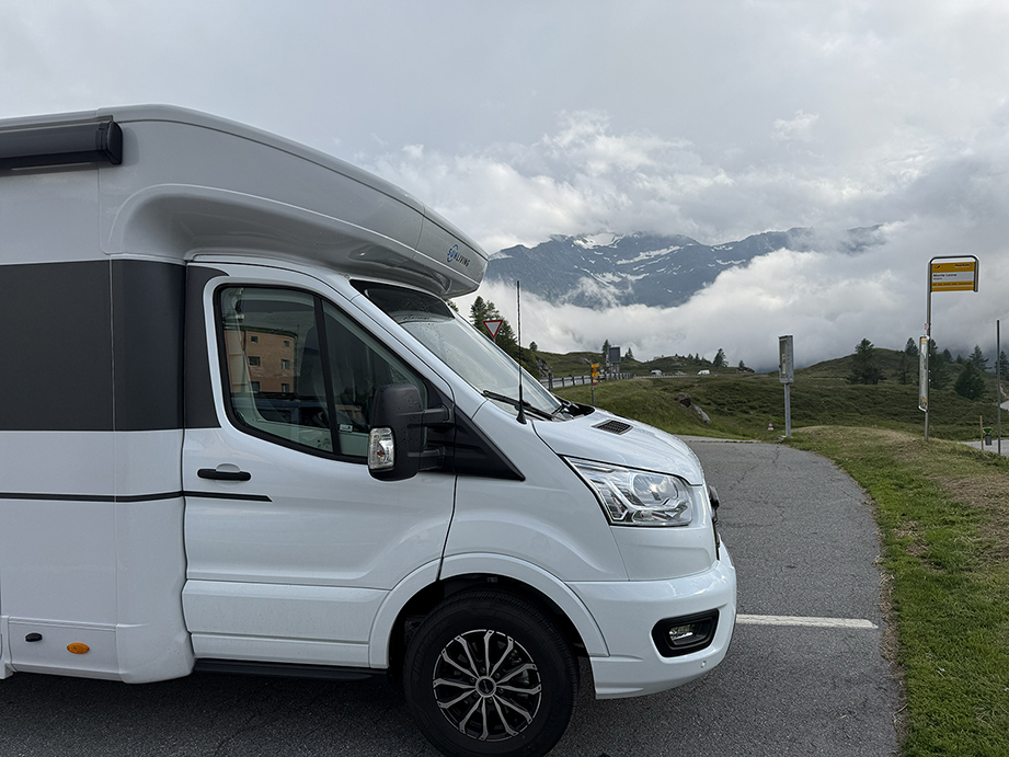 Wären wir mit unserem eigenen Zeltanhänger unterwegs gewesen, hätte ich mir Sorgen gemacht: noch so eine lange Fahrt und dann alles im Regen aufbauen. Wie anders war es jetzt: Mit dem Gedanken, dass wir bald das Wohnmobil abstellen und in einem Restaurant am Boulevard Pizza essen könnten, genossen wir die letzten Stunden dieses Reisetages. Wir machten einen langen Stopp am wirklich schönen Simplonpass, um die Aussicht zu geniessen, die bei nassem Wetter atemberaubend war. Und dann fuhren wir weiter zum Campingplatz, wo wir nur noch das Wohnmobil abstellen mussten, bevor wir Pizza essen gingen. Am nächsten Tag war es trocken, und wir nutzten unsere Übernachtung, um im See zu baden und unsere Reise erst um 12 Uhr mittags fortzusetzen. Mit dem Wohnmobil ist das ganz einfach: Tisch und Stühle einpacken, und schon konnten wir losfahren. Was für eine Freiheit!